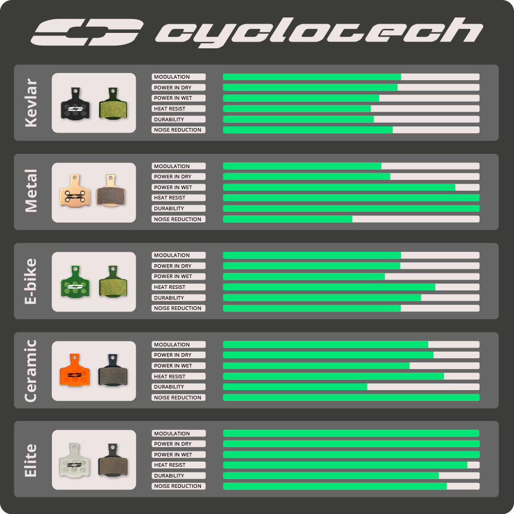 Cyclotech Components is een Nederlands merk dat sinds 2015 veilige en betrouwbare remblokken van hoogwaardige kwaliteit ontwikkelt. Zowel voor recreatief als competitief gebruik. De Kevlar compound is de slimme instap-upgrade in de hoogwaardige Cyclotech Prodisc lijn. Deze schijfremblokken combineren de voordelen van organische remblokken (uitstekende initiële 'bite' en modulatie) met de verhoogde duurzaamheid van Kevlar-vezels.